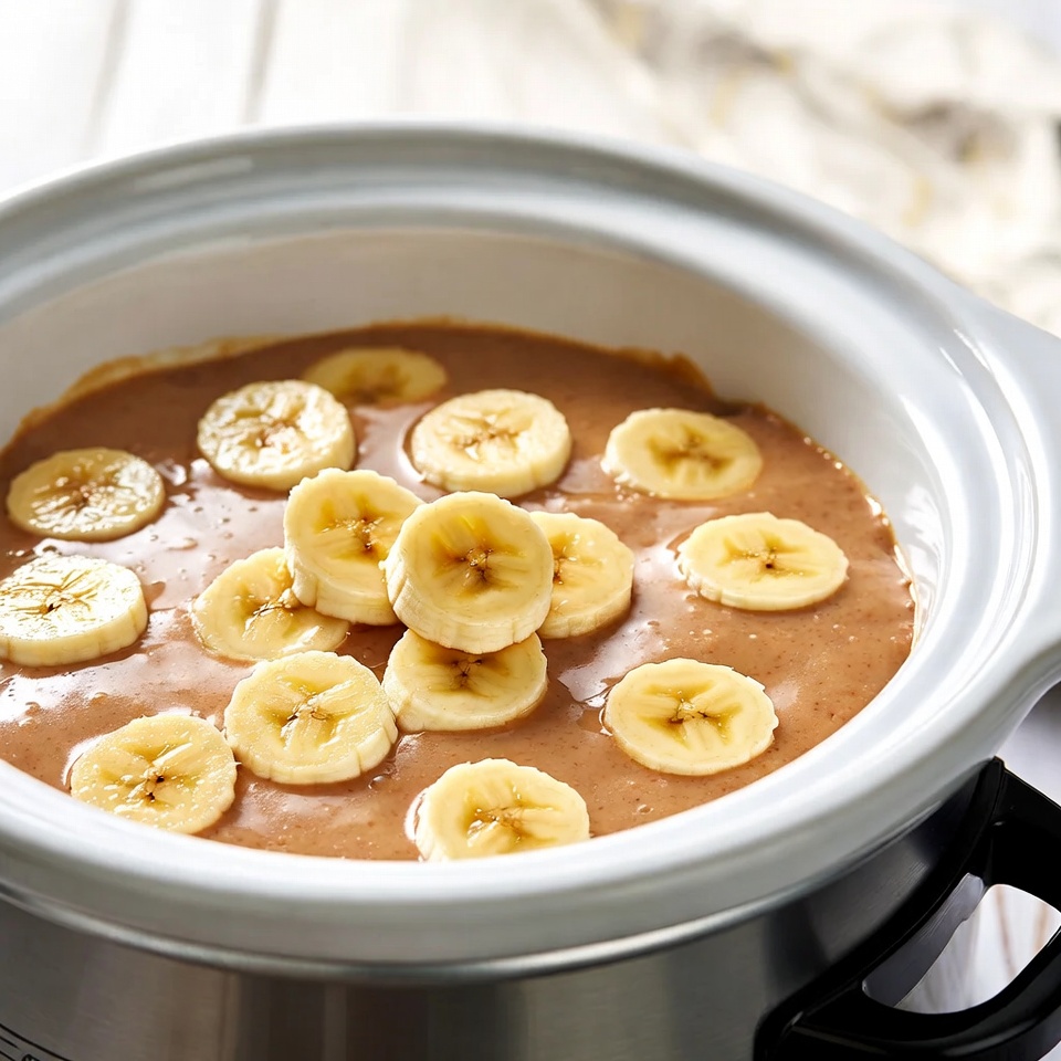 3. 準備しておいたスロークッカーに、バナナのミックスを流し入れ、表面を平らにならす。