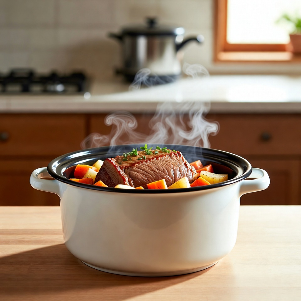 スロークッカーで作る、柔らかくほぐれる牛肉と野菜のポットローストレシピです。シンプルな材料で、深いコクと香りを楽しめます。