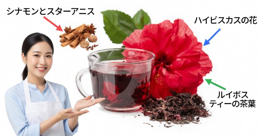 ハイビスカス(フロール・デ・ハマイカ)、ローリエ、シナモン、クローブを組み合わせたハーブティーは、