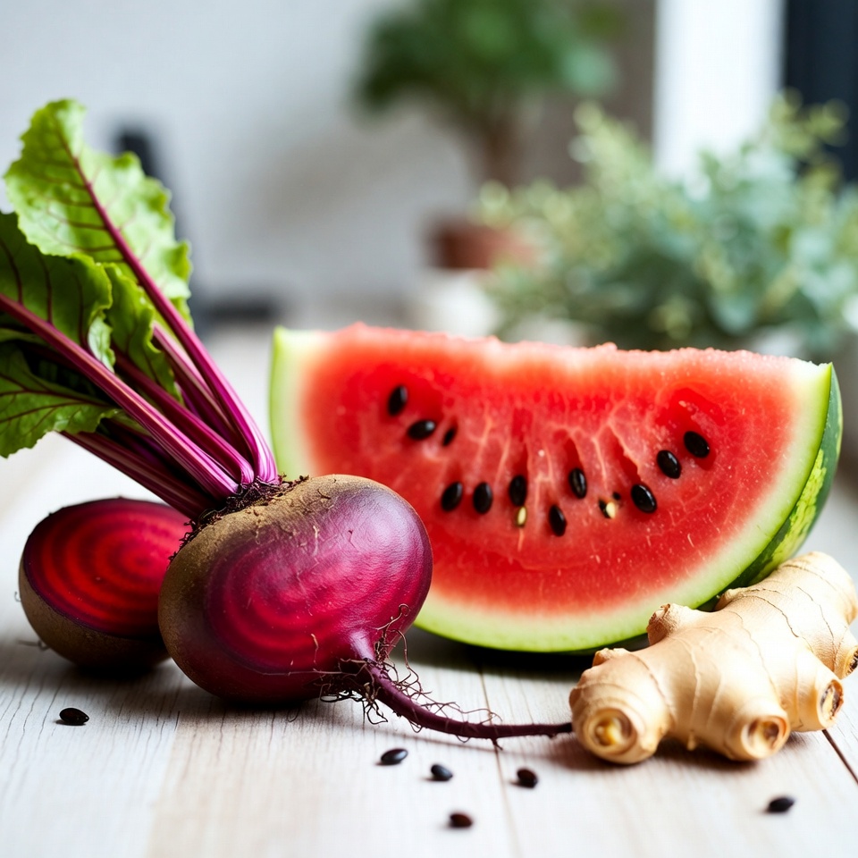 腎臓ケアに役立つ飲み物として紹介される、スイカ・ビーツ・生姜を使ったシンプルなレシピです。材料をミキサーにかけるだけで、手軽に作れるのが魅力です。