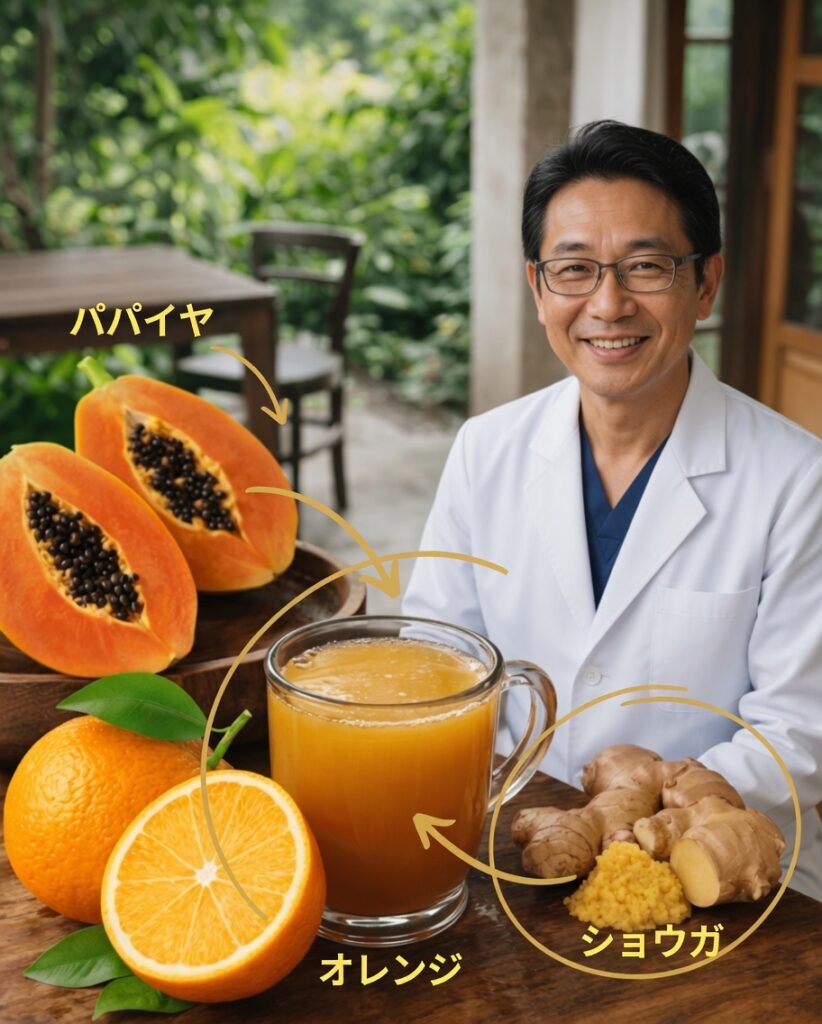 パパイヤ・オレンジ・生姜のドリンクは、ビタミンや抗酸化成分、抗炎症作用が期待される要素をまとめて取り入れられる、手軽で自然な方法です。外側のケアに加えて、内側からのサポートを意識したい人にとって、毎日の習慣として取り入れやすい選択肢になります。