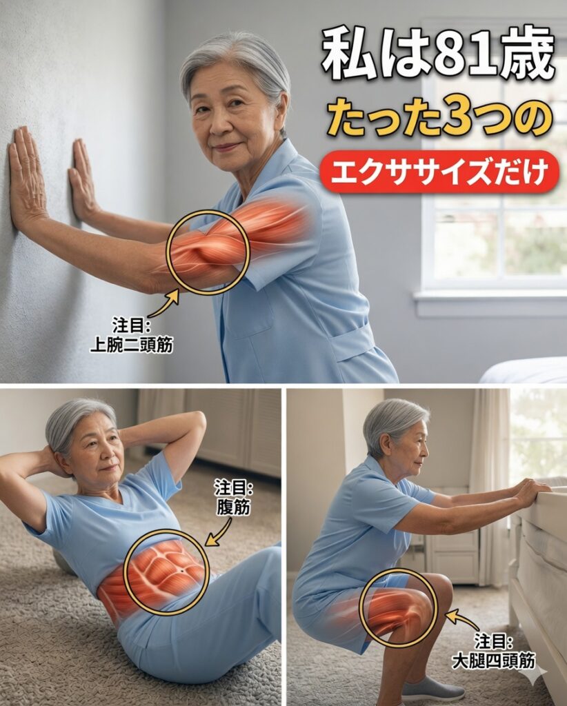 年齢を重ねても、筋力と活力は取り戻せます。壁腕立て伏せ・引く動作(補助付き可)・スクワットの3つの基本運動を、無理のない範囲で続けるだけでも、バランスや体の安定感は大きく変わります。