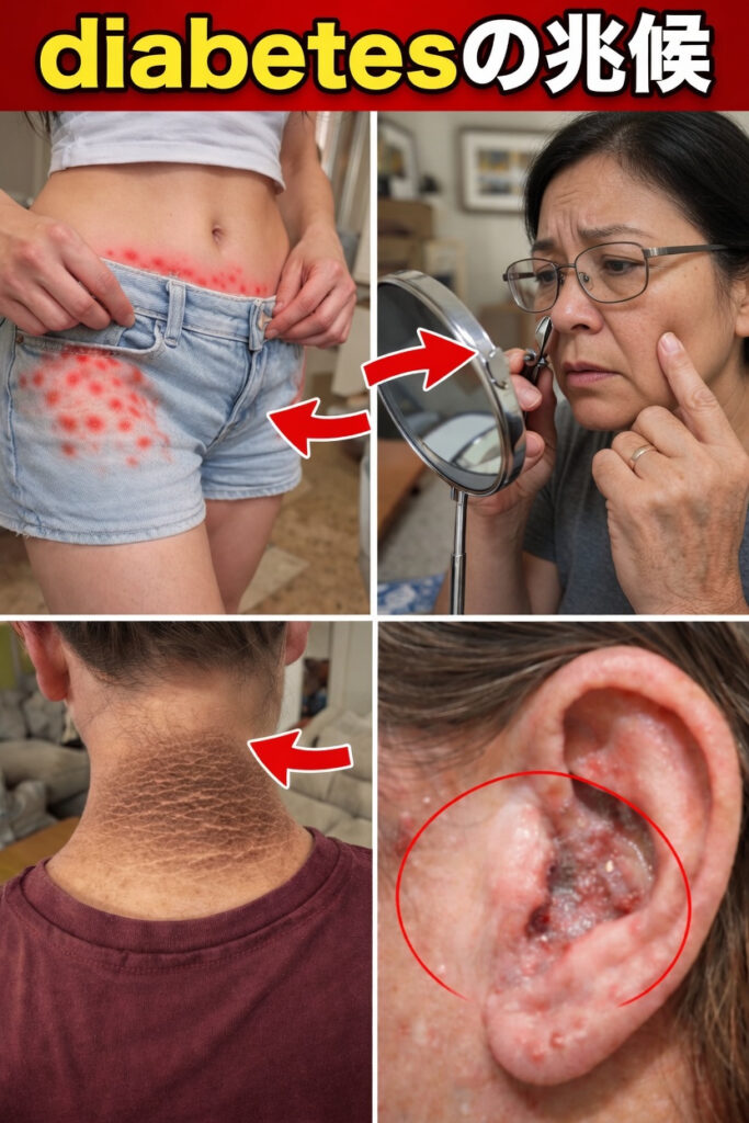 また、太ももや腰まわり、下半身に赤みやかゆみを伴う斑点が出ることもあります。小さな発疹のように見える場合もあり、血糖値の高い状態が長く続くことで、肌環境に影響する可能性があります。