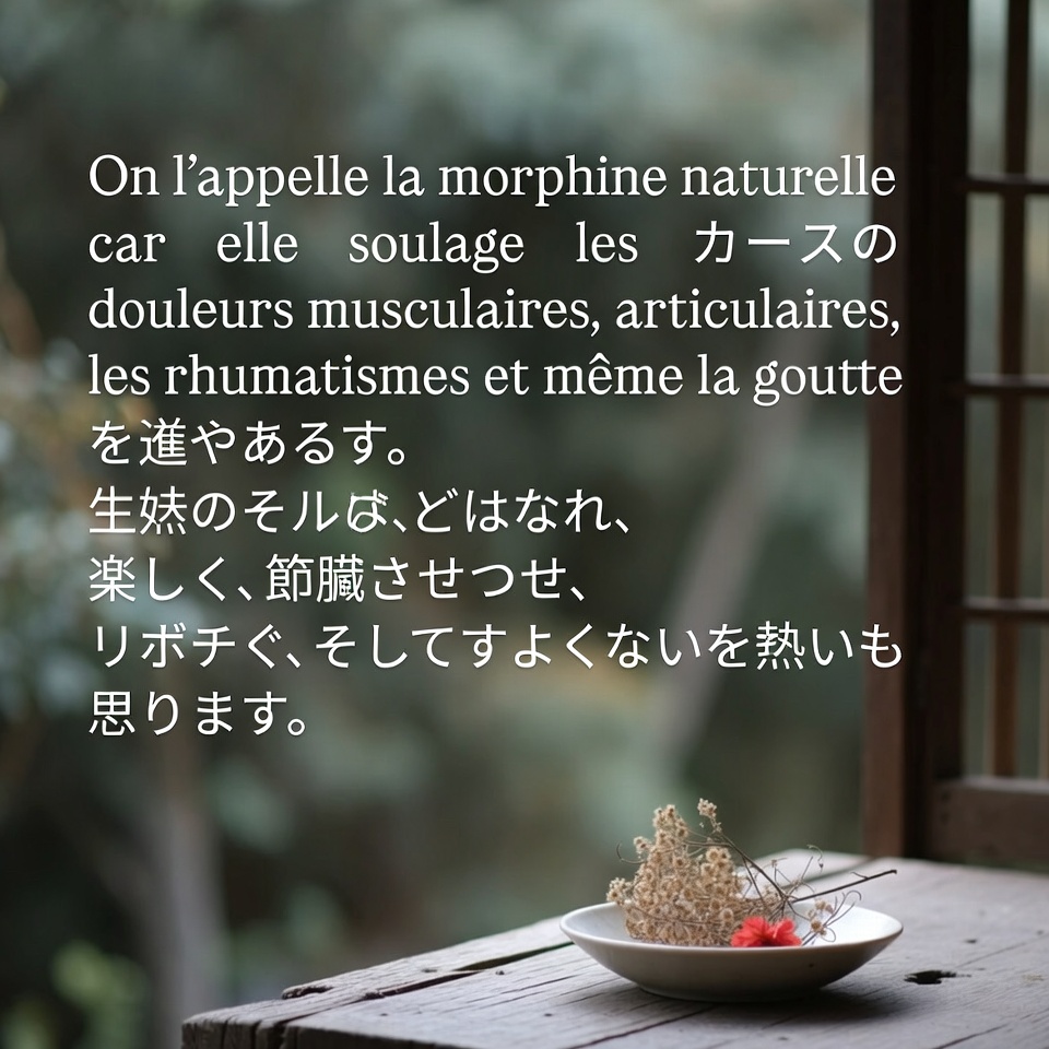 「天然のモルヒネ」と呼ばれることもありますが、それは依存性のある薬のような意味ではなく、体をじんわり温めながら穏やかに落ち着かせる働きが期待されているためです。重い副作用の心配が少ない自然素材として、昔から重宝されてきました。