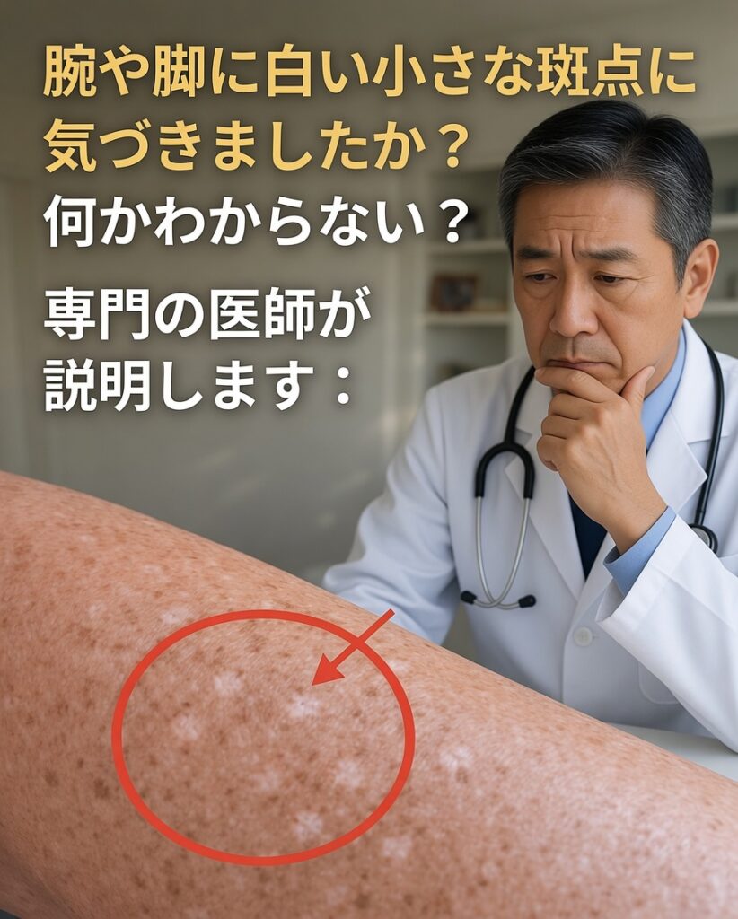 最近、腕や脚に小さな白い点が増えてきた気がして、なんとなく落ち着かない——そんな経験はありませんか。平らで小さな淡い斑点は、光の反射の仕方が周囲と違うため、日焼けした肌ほど目立ちやすいのが特徴です。特に40代以降になると気づきやすく、「老化?紫外線ダメージ?それとも何か病気?」と不安になり、暑い日でも短い服を避けたくなることがあります。