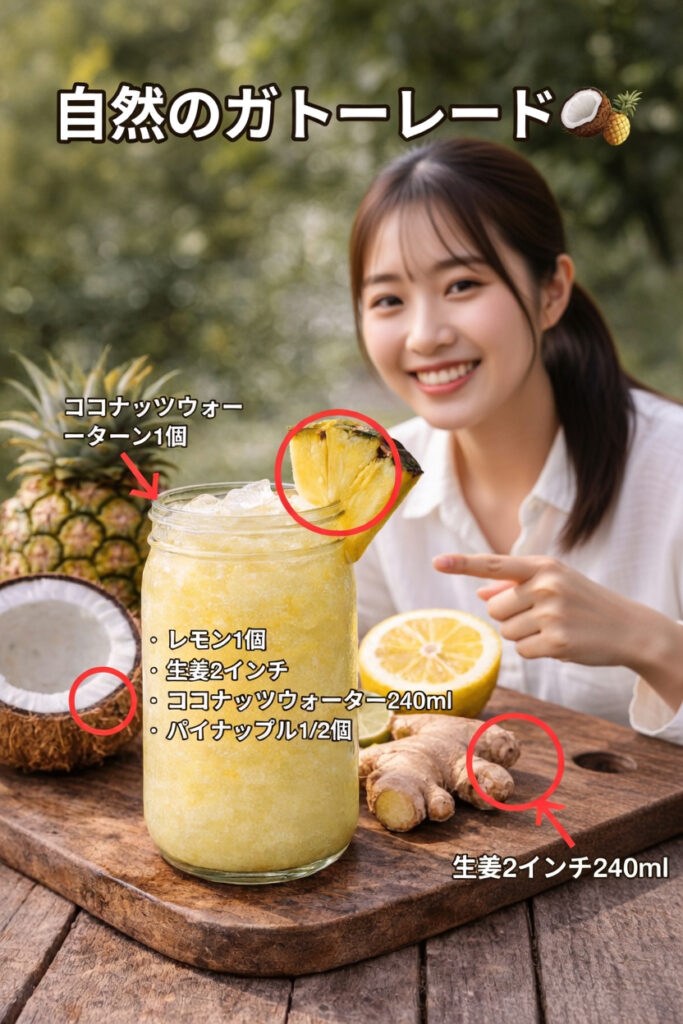 そんな中で注目されているのが、手作りドリンクの**「ネイチャーズ・ゲータレード」**です。見た目はとてもシンプルですが、本当のポイントは材料そのものではなく、それらが体内でどのように働き合うかにあります。